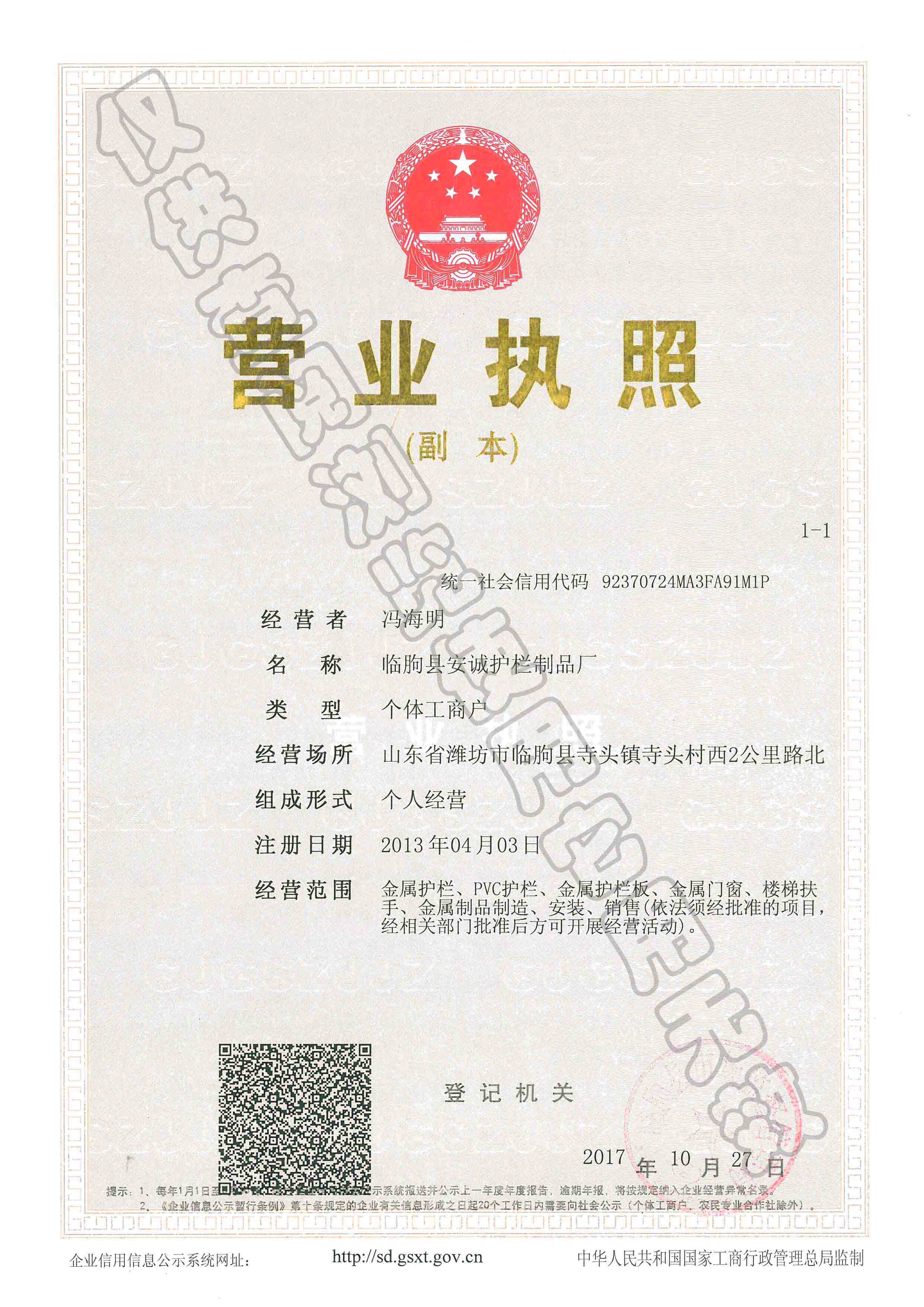 濰坊安誠(chéng)金屬制品有限公司下設(shè)臨朐安誠(chéng)護(hù)欄制品廠(chǎng),廠(chǎng)址在臨朐呂匣新興工業(yè)園,廠(chǎng)房占地20畝, 多年以來(lái),我們秉著“用心打造,用質(zhì)量說(shuō)話(huà)”的理念,靠“熱情、創(chuàng)新、堅(jiān)持、 團(tuán)結(jié)”的企業(yè)精神,精益求精,以誠(chéng)為本打造行內(nèi)知名品牌。 因?yàn)檎\(chéng)信所以自信!讓客戶(hù)放心,省心,滿(mǎn)意是我們的目的。