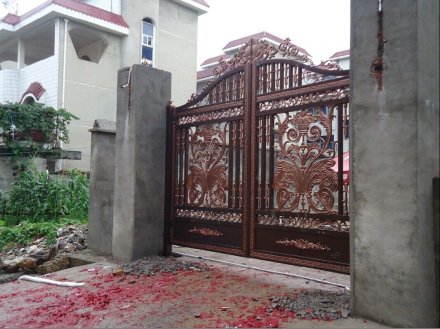 不要經(jīng)常用有水漬(或其他溶液)的手打開門鎖,以免其變色。在打開或轉(zhuǎn)動(dòng)門鎖把手時(shí),不要用力過猛,這樣會(huì)降低門鎖的使用壽命。合頁、門鎖等常用五金,一旦松動(dòng),應(yīng)立即擰緊.當(dāng)門鎖打開不正常時(shí),可在鎖孔內(nèi)加入適量的鉛筆沫,切記用食用油等物品潤滑。, 漆面出現(xiàn)結(jié)皮或粗?,F(xiàn)象時(shí),應(yīng)采取過濾措施,以免刷漆后漆膜不平整,堵塞噴槍。, 4、廠家的生產(chǎn)加工工藝:正規(guī)廠家生產(chǎn)的別墅鋁藝大門,其加工比較精細(xì),切線流暢、角度一致,在拼接過程中應(yīng)該不會(huì)出現(xiàn)較明顯的縫隙,密封性能好,開關(guān)順暢。劣質(zhì)的庭院別墅大門,特別是鋁合金室外產(chǎn)品如果加工不合格,會(huì)出現(xiàn)密封性質(zhì)問題,不僅漏風(fēng)漏雨,而且在強(qiáng)風(fēng)和大的外力的作用下,玻璃會(huì)出現(xiàn)炸裂、脫落現(xiàn)象,從而給業(yè)主造成損失財(cái)物甚至傷人的現(xiàn)象。, 為保持鋁藝院門的原色,需對(duì)鋁藝院門進(jìn)行兩次以上的磷化處理,在其表面形成一層保護(hù)膜,浸泡數(shù)分鐘,這之后還要經(jīng)過噴涂保護(hù)漆、230℃烘干、自然冷卻等步驟,才能完成一戶完整的鋁藝院門的表面色彩亮感。生產(chǎn)工藝,除油除銹除氧化-水洗-酸洗-拋光-水洗-中和-水洗-著色處理-洗滌-干燥及其他后處理。, 3、沖孔制作的,安裝比較簡單;